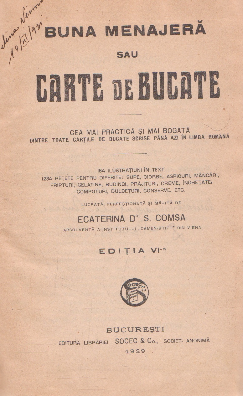 Comandă online cartea "Buna menajera sau carte de bucate" la 104,70 lei scrisă de Ecaterina S. Comsa, tiparită la editura Librariei Socec în anul 1929 cu un număr de 572 pagini. cu plata ramburs sau online cu cardul. Momentan titlul "Buna menajera sau carte de bucate" nu este disponibil însa vă puteți înscrie pentru a fi notificat în momenul reaprovizionarii.