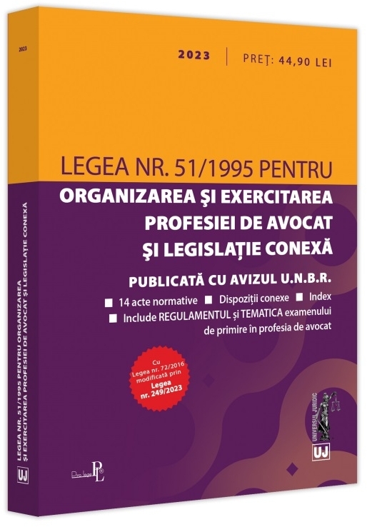 Comandă online cartea "Legea nr. 51/1995 pentru organizarea şi exercitarea profesiei de avocat şi legislaţie conexă : publicată cu avizul U.N.B.R." la 47,50 lei isbn 9786063912719, tiparită la editura Universul Juridic în anul 2023 cu un număr de 480 pagini. Cartea poate fi livrată în circa 2 zile cu plata ramburs sau online cu cardul.
