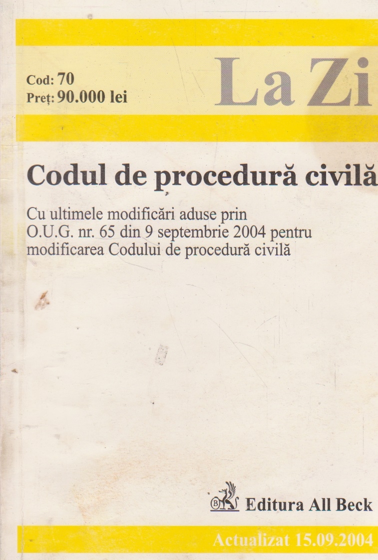 Comandă online cartea "Codul de Procedura Civila. Actualizat 15.09.2004" la 10,50 lei, tiparită la editura All Beck în anul 2004 cu un număr de 192 pagini categorie Drept, Coduri si legi comentate. cu plata ramburs sau online cu cardul. Momentan titlul "Codul de Procedura Civila. Actualizat 15.09.2004" nu este disponibil însa vă puteți înscrie pentru a fi notificat în momenul reaprovizionarii.