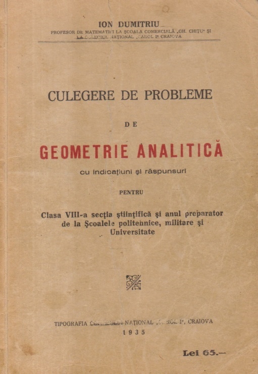 Comandă online cartea "Culegere de probleme de Geometrie Analitica cu indicatiuni si raspunsuri (Editie 1935)" la 47,60 lei scrisă de Ion DUMITRIU, tiparită la editura Tipografia Colegiului National Carol I, Craiova în anul 1935 cu un număr de 102 pagini. cu plata ramburs sau online cu cardul. Momentan titlul "Culegere de probleme de Geometrie Analitica cu indicatiuni si raspunsuri (Editie 1935)" nu este disponibil însa vă puteți înscrie pentru a fi notificat în momenul reaprovizionarii.
