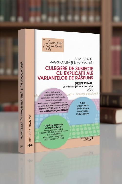 Comandă online cartea "Admiterea în magistratură şi în avocatură : culegere de subiecte cu explicaţii ale variantelor de răspuns,Drept penal" la 85,43 lei isbn 9786063913037 scrisă de Mihai Adrian Hotca , Laura Maria Stanila , Teodor Manea , ... , Cristian Bălan , Giulia Sologon , Mihai Adrian Hotca (coord.), tiparită la editura Universul Juridic în anul 2023. Cartea poate fi livrată în circa 2 zile cu plata ramburs sau online cu cardul.