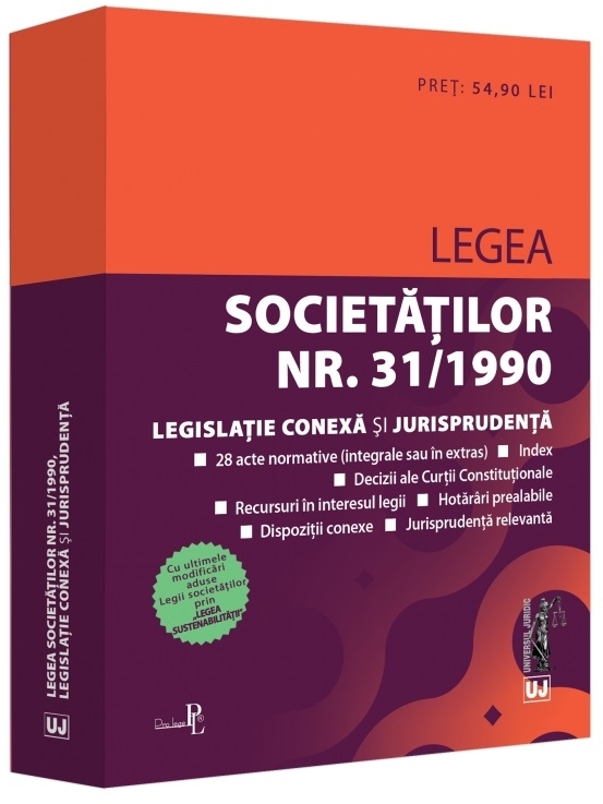 Comandă online cartea "Legea societăţilor nr. 31/1990, legislaţie conexă şi jurisprudenţă" la 58,00 lei isbn 9786063913334, tiparită la editura Universul Juridic în anul 2024 cu un număr de 664 pagini. Cartea poate fi livrată în circa 5 zile cu plata ramburs sau online cu cardul.