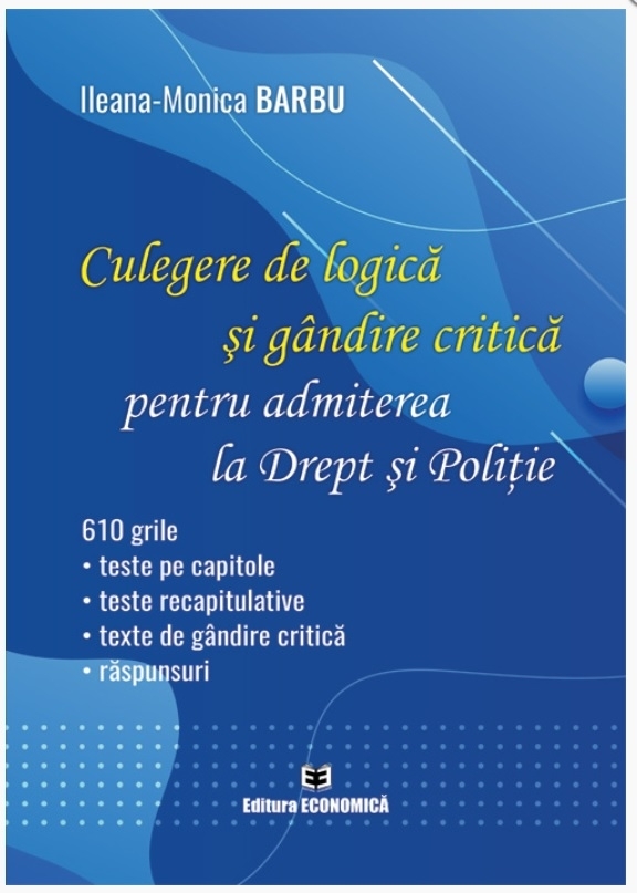 Comandă online cartea "Culegere de logică şi gândire critică pentru admiterea la drept şi poliţie" la 44,22 lei isbn 9786060930488 scrisă de Ileana-Monica Barbu, tiparită la editura Economica în anul 2023. Cartea poate fi livrată în circa 2 zile cu plata ramburs sau online cu cardul.