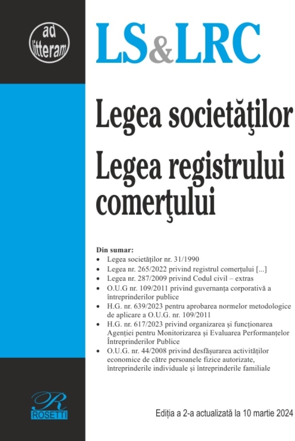 Comandă online cartea "Legea societăţilor,Legea registrului comerţului" la 48,60 lei isbn 9786060251408, tiparită la editura Rosetti în anul 2024 cu un număr de 384 pagini. Cartea poate fi livrată în circa 20 zile cu plata ramburs sau online cu cardul.