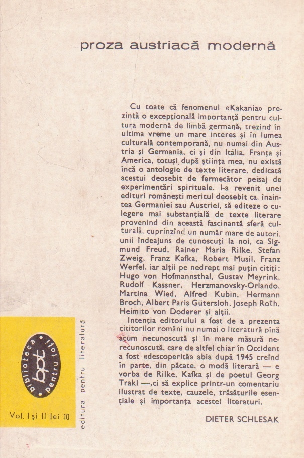 Intentia editorului a fost de a prezenta cititorilor romani nu numai o literatura pana acum necunoscuta si in mare masura nerecunoscuta, care de altfel chiar in Occident a fost "descoperita" abia dupa 1945 creand in parte, din pacate, o moda literara - e vorba de Rilke, Kafka si de poetul Georg Trakl -, ci sa explica printr-un comentariu ilustrat de texte, cauzele, trasaturile esentiale si importanta acestei literaturi