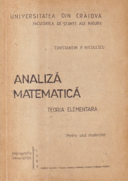 Comandă online cartea "Analiza matematica - Teoria elementara (Niculescu)" la 20,10 lei scrisă de Constantin P. Niculescu, tiparită la editura Reprografia Universitatii din Craiova face parte din colecția Facultatea de Stiinte ale Naturii în anul 1989. cu plata ramburs sau online cu cardul. Momentan titlul "Analiza matematica - Teoria elementara (Niculescu)" nu este disponibil însa vă puteți înscrie pentru a fi notificat în momenul reaprovizionarii.