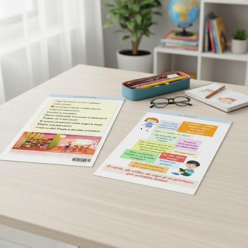 O planșă didactică DUO față - verso, care îi învață pe copii cum să se comporte la școală și la bibliotecă.