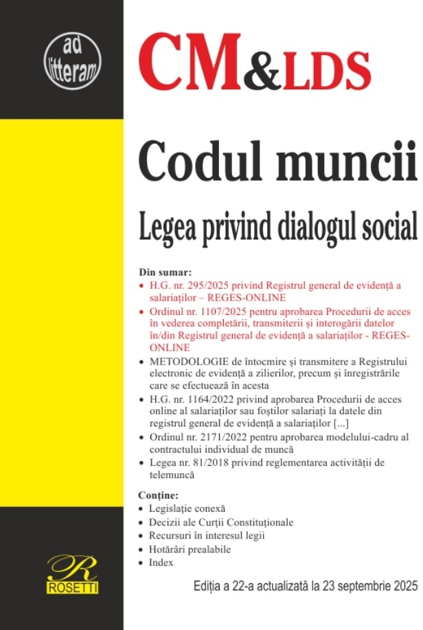 Comandă online cartea "Codul muncii,Legea privind dialogul social,Registrul general de evidenţă a salariaţilor,Registrul electronic de evidenţă a zilierilor : legislaţie conexă, decizii ale Curţii Constituţionale, recursuri în interesul legii, hotărâri prealabile, index" la 39,60 lei isbn 9786060251767, tiparită la editura Rosetti în anul 2025 cu un număr de 264 pagini. Cartea poate fi livrată în circa 20 zile cu plata ramburs sau online cu cardul.
