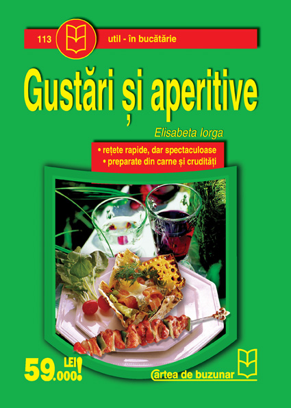 Comandă online cartea "Gustari si aperitive" la 6,20 lei scrisă de Elisabeta Iorga, tiparită la editura Cartea de buzunar categorie Gastronomie, Diverse. cu plata ramburs sau online cu cardul. Momentan titlul "Gustari si aperitive" nu este disponibil însa vă puteți înscrie pentru a fi notificat în momenul reaprovizionarii.