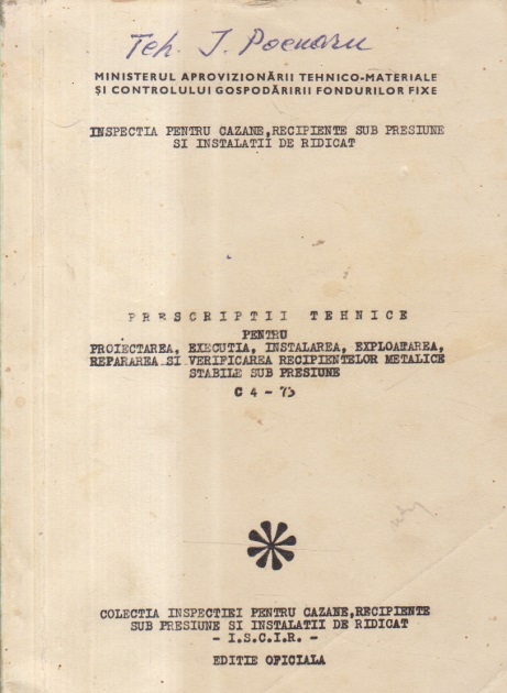 Comandă online Prescriptii tehnice pentru proiectarea, executia, instalarea, exploatarea, repararea si verificarea recipientelor metalice stabila sub presiune C4 - 73 la 25,00 lei scrisă de Oficiul de Documentare si Publicatii, tiparită la editura Bucuresti în anul 1974 cu un număr de 328 pagini. Livrare din stoc cu plata ramburs sau online cu cardul.