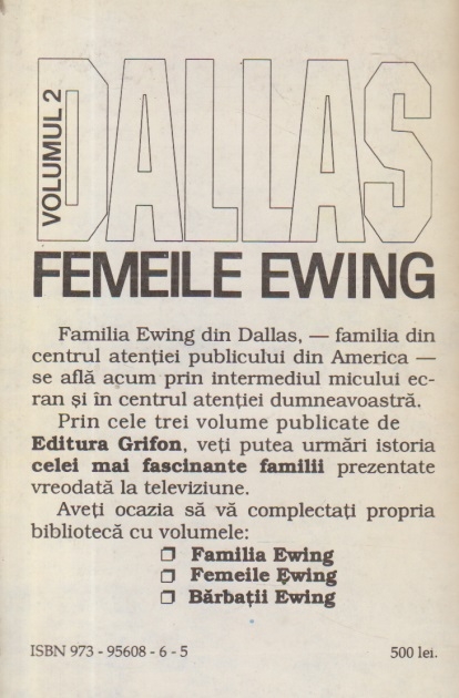 Comandă online cartea "DALLAS, Volumul al II-lea - Femeile Ewing" la 13,60 lei scrisă de Burt Hirschfeld, tiparită la editura Grifon în anul 1992 cu un număr de 361 pagini. cu plata ramburs sau online cu cardul. Momentan titlul "DALLAS, Volumul al II-lea - Femeile Ewing" nu este disponibil însa vă puteți înscrie pentru a fi notificat în momenul reaprovizionarii.