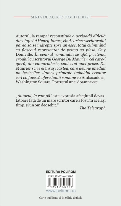 Autorul, la rampa! reconstituie o perioada dificila din viata lui Henry James, cind cariera scriitorului parea sa se indrepte spre un esec, totul culminind cu fiascoul reprezentat de prima sa piesa, Guy Domville. In centrul romanului se afla prietenia eroului cu scriitorul George Du Maurier, cel care-i ofera, din camaraderie, subiectul unei proze. Du Maurier scrie el insusi cartea, care devine imediat un bestseller. James primeste imboldul creator ce-l va face sa ofere lumii romane ca Ambasadorii, Washington Square, Portretul unei doamne etc.Comandă online cartea "Autorul, la rampă!" la 10,60 lei isbn 9789734623143 scrisă de David Lodge, tiparită la editura Polirom face parte din colecția BIBLIOTECA POLIROM -> Seria de autor "David Lodge". cu plata ramburs sau online cu cardul. Momentan titlul "Autorul, la rampă!" nu este disponibil însa vă puteți înscrie pentru a fi notificat în momenul reaprovizionarii.