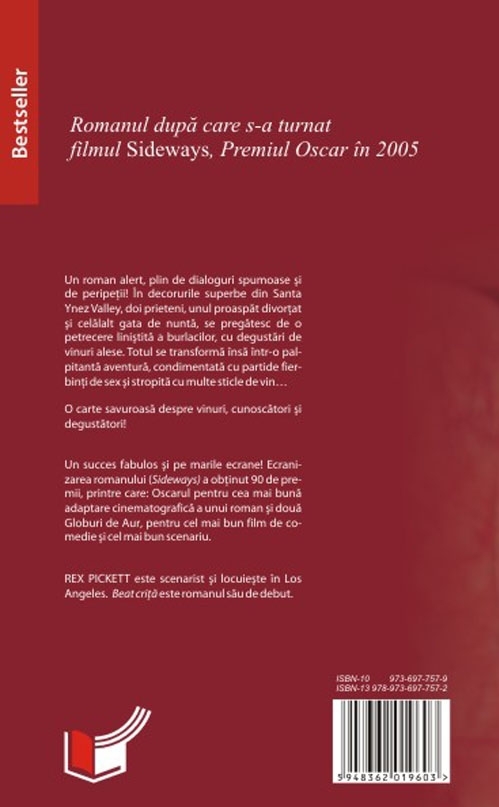 Un roman alert, plin de dialoguri spumoase şi de peripeţii! În decorurile superbe din Santa Ynes Valley, doi prieteni, unul proaspăt divorţat şi celălalt gata de nuntă, se pregătesc de o petrecere liniştită a burlacilor, cu degustări de vinuri alese. Totul se transformă însă într-o palpitantă aventură, condimentată cu partide fierbinţi de sex şi stropită cu multe sticle de vin. O carte savuroasă despre vinuri, cunoscători şi degustători! Un succes fabulos şi pe marile ecrane! Ecranizarea romanului (Sideways) a obţinut 90 de premii, printre care: Oscarul pentru cea mai bună adaptare cinematografică a unui roman şi două Globuri de Aur, pentru cel mai bun film de comedie şi cel mai bun scenariu. Rex Pickett este scenarist şi locuieşte în Los Angeles. Beat criţă este romanul său de debut.