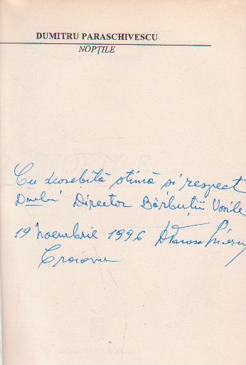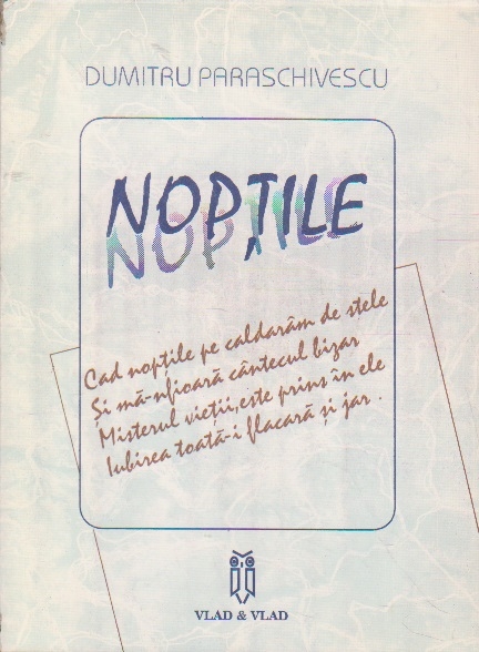 Comandă online cartea "Noptile - Versuri (Cu autograful autorului)" la 26,40 lei scrisă de Dumitru Paraschivescu, tiparită la editura Vlad&Vlad în anul 1996 cu un număr de 96 pagini. Livrare din stoc cu plata ramburs sau online cu cardul.