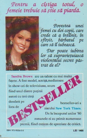 Comandă online cartea "Sa nu trimiti flori" la 15,90 lei scrisă de Sandra Brown, tiparită la editura Miron face parte din colecția Bestseller în anul 1994. cu plata ramburs sau online cu cardul. Momentan titlul "Sa nu trimiti flori" nu este disponibil însa vă puteți înscrie pentru a fi notificat în momenul reaprovizionarii.