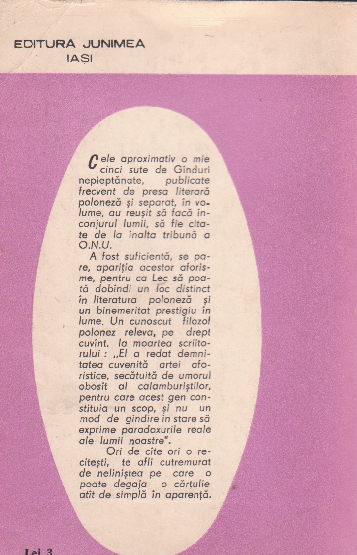 Comandă online cartea "Ginduri nepieptanate" la 6,20 lei scrisă de Stanislaw Jerzy Lec, tiparită la editura Junimea în anul 1971 cu un număr de 136 pagini. cu plata ramburs sau online cu cardul. Momentan titlul "Ginduri nepieptanate" nu este disponibil însa vă puteți înscrie pentru a fi notificat în momenul reaprovizionarii.