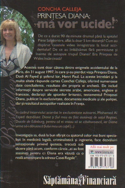 De ce a durat 90 de minute drumul până la spitalul La Pite Salpetriere, aflat la doar 5 km distanță? Cum au dispărut casetele video înregistrate la locul accidentului? De ce au îmbălsămat fără permisiune și înainte de autopsie trupul Dianei? Era Prințesa de Walles însărcinată? Acestea sunt doar câteva dintre enigmele accidentului de la Paris, din 31 august 1997, în care și-au pierdut viața Prințesa Diana, Dodi Al Fayed și șoferul lor, Henry Paul. La aceste întrebări și la multe altele răspunde cartea Conchei Calleja, oferind numeroase date concludente, rezultate din propria ei anchetă. Ele includ informații despre serviciile secrete arabe, americane, engleze și franceze, declarații ale spionilor britanici, testamentul Prințesei Diana, publicat în exclusivitate, documente medicale și ale poliției, dar și rezultatul autopsiilor realizate în Franța. în cadrul interviului acordat în exclusivitate autoarei, Mohamed Al Fayed dezvăluie: Diana și fiul meu au fost asasinați de soțul Reginei, Ducele de Edinburgh, pentru că ei urmau să se căsătorească, iar Diana urma să-i dăruiască fiului meu un copil(...) Investigația sa, dusă la bun sfârșit cu ajutorul celor mai buni specialiști în medicină legală, criminalistică și inginerie, face dezvăluiri senzaționale privind ipoteza, trecută sub tăcere până acum, conform căreia „ei au fost asasinați pentru ca Diana era văzută ca o reală amenințare la adresa Casei Regale