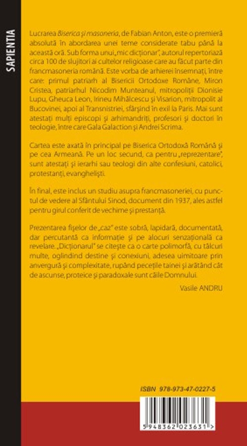Lucrarea Biserica şi masoneria, de Fabian Anton, este o premieră absolută în abordarea unei teme considerate tabu până la această oră. Sub forma unui `mic dicţionar`, autorul repertoriază circa 100 de slujitori ai cultelor religioase care au făcut parte din francmasoneria română. Este vorba de arhierei însemnaţi, între care : primul patriarh al Bisericii Ortodoxe Române, Miron Cristea, patriarhul Nicodim Munteanul, mitropoliţii Dionisie Lupu, Gheuca Leon, Irineu Mihălcescu şi Visarioan, mitropolit al Bucovinei, apoi al Transnistriei, sfârşind în exil la Paris. Mai sunt atestaţi mulţi episcopi şi arhimandriţi, profesori şi doctori în teologie, între care Gala Galaction şi Andrei Şaguna. Cartea este axată în principal pe Biserica Ortodoxa Română şi pe cea Armeană. Pe un loc secund, ca pentru `reprezentare` sunt atestaţi şi ierarhi sau teologi din alte confesiuni, catolici, protestanţi, evanghelişti. În final, este inclus un studiu asupra francmasoneriei, cu punctul de vedere al Sfântului Sinod, document din 1937, ales astfel pentru girul de vechime şi prestanţă.(Vasile Andru)