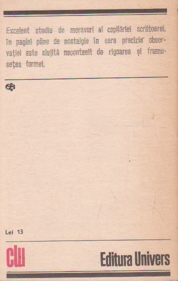 Excelent studiu de moravuri al copilariei scriitoarei,in pagini pline de nostalgie in care precizia observatiei este slujita necontenit de rigoarea si frumusetea formei
