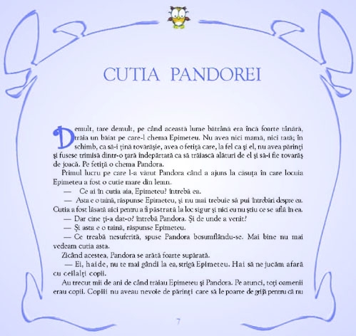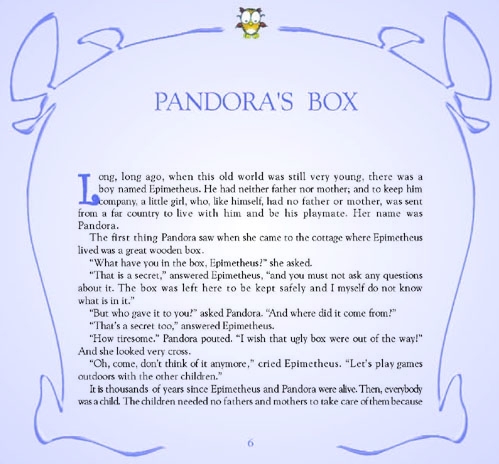 Vechiul mit european este rescris aici de catre unul dintre cei mai renumiti romancieri americani. Astfel, istoria devine una cu doi copii din timpurile fericite ale umanitatii, Epimeteu si Pandora, prea curiosi pentru a respecta intelegerea de a nu deschide cutia care parea un cadou frumos si ispititor. Detaliul reactiei sufletesti si emotia pura a oamenilor din acele imemoriale vremuri ale lipsei de griji sunt cuceritoare. Veti avea, de asemenea, ocazia sa observati transpunerea excelenta in limba romana a traducatorului si sa incercati voi insiva alte variante.