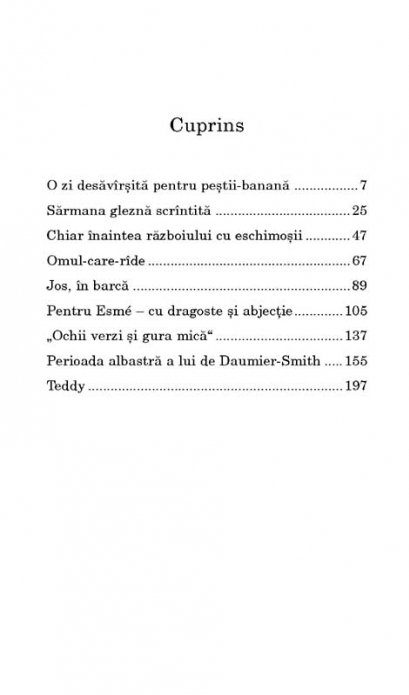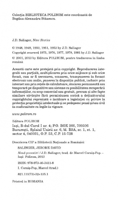 Traducere de Marcel Cornis-Pop J.D. Salinger este autorul romanului-cult De veghe in lanul de secara, roman situat de ani de zile in topul preferintelor cititorilor din Romania. De veghe in lanul de secara continua sa fie, la peste cincizeci de ani de la aparitie, cartea de capatii a adolescentei. Volumul exploreaza o lume dominata de violenta irationala, paranoia, materialism vulgar si ipocrizie. Personajele autorului sint copii confruntati cu misterele lumii adulte, oameni maturi excedati de greutatile vietii, cinici si iresponsabili.Comandă online cartea "Nouă povestiri" la 31,70 lei isbn 9789734634118 scrisă de J. D. Salinger , J.D. Salinger, tiparită la editura Polirom face parte din colecția BIBLIOTECA POLIROM -> Proza XX. Cartea poate fi livrată în circa 2 zile cu plata ramburs sau online cu cardul.