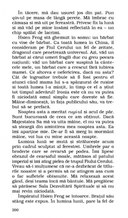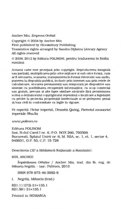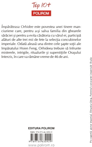 Traducere din limba engleza de Mihaela Negrila Imparateasa Orhidee este povestea unei tinere manciuriene care, pentru a-si salva familia din ghearele saraciei si pentru a evita casatoria cu varul ei, participa alaturi de alte trei mii de fete la selectia concubinelor imperiale. Odata aleasa una dintre cele sapte sotii ale imparatului Hsien Feng, Orhideea trebuie sa infrunte misterele, intrigile, ritualurile si superstitiile Orasului Interzis, in care va ramine vreme de 46 de ani.