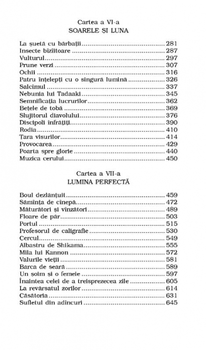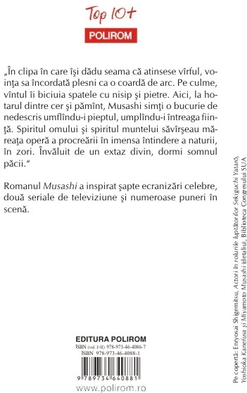 Traducere si note de Angela Hondru Romanul Musashi a inspirat sapte ecranizari celebre, doua seriale de televiziune si numeroase puneri in scena. „In clipa in care isi dadu seama ca atinsese virful, vointa sa incordata plesni ca o coarda de arc. Pe culme, vintul ii biciuia spatele cu nisip si pietre. Aici, la hotarul dintre cer si pamint, Musashi simti o bucurie de nedescris umflindu-i pieptul, umplindu-i intreaga fiinta. Spiritul omului si spiritul muntelui savirseau mareata opera a procrearii in imensa intindere a naturii, in zori. Invaluit de un extaz divin, dormi somnul pacii.”