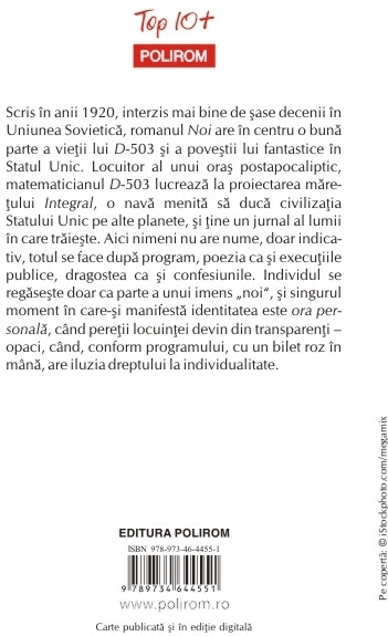Traducere din limba rusa de Inna Cristea Scris in anii 1920, interzis mai bine de sase decenii in Uniunea Sovietica, romanul Noi are in centru o buna parte a vietii lui D-503 si a povestii lui fantastice in Statul Unic. Locuitor al unui oras postapocaliptic, matematicianul D-503 lucreaza la proiectarea maretului Integral, o nava menita sa duca civilizatia Statului Unic pe alte planete, si tine un jurnal al lumii in care traieste. Aici nimeni nu are nume, doar indicativ, totul se face dupa program, poezia ca si executiile publice, dragostea ca si confesiunile. Individul se regaseste doar ca parte a unui imens „noi”, si singurul moment in care-si manifesta identitatea este ora personala, cind peretii locuintei devin din transparenti – opaci, cind, conform programului, cu un bilet roz in mina, are iluzia dreptului la individualitate.