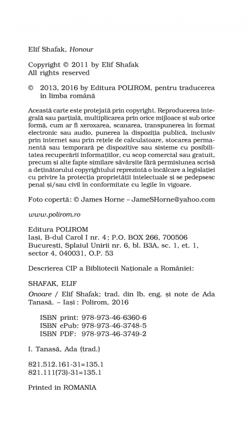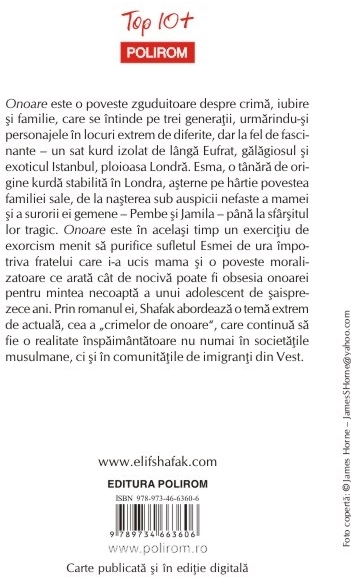 Comandă online cartea "Onoare (ediţie de buzunar)" la 42,20 lei isbn 9789734663606 scrisă de Elif Shafak, tiparită la editura Polirom face parte din colecția Top 10+. Cartea poate fi livrată în circa 2 zile cu plata ramburs sau online cu cardul.