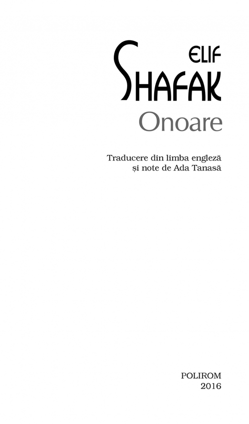 Onoare este o poveste zguduitoare despre crimă, iubire şi familie, care se întinde pe trei generaţii, urmărindu-şi personajele în locuri extrem de diferite, dar la fel de fascinante – un sat kurd izolat de lîngă Eufrat, gălăgiosul şi exoticul Istanbul, ploioasa Londră. Esma, o tînără de origine kurdă stabilită în Londra, aşterne pe hîrtie povestea familiei sale, de la naşterea sub auspicii nefaste a mamei şi a surorii ei gemene – Pembe şi Jamila – pînă la sfîrşitul lor tragic. Onoare este în acelaşi timp un exerciţiu de exorcism menit să purifice sufletul Esmei de ura împotriva fratelui care i-a ucis mama şi o poveste moralizatoare ce arată cît de nocivă poate fi obsesia onoarei pentru mintea necoaptă a unui adolescent de şaisprezece ani. Prin romanul ei, Shafak abordează o temă extrem de actuală, cea a „crimelor de onoare”, care continuă să fie o realitate înspăimîntătoare nu numai în societăţile musulmane, ci şi în comunităţile de imigranţi din Vest.