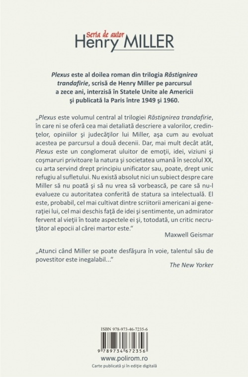 Comandă online cartea "Plexus (ediţia 2018)" la 63,40 lei isbn 9789734672356 scrisă de Henry Miller , Henry Miller, tiparită la editura Polirom face parte din colecția BIBLIOTECA POLIROM -> Seria de autor "Henry Miller". Cartea poate fi livrată în circa 5 zile cu plata ramburs sau online cu cardul.