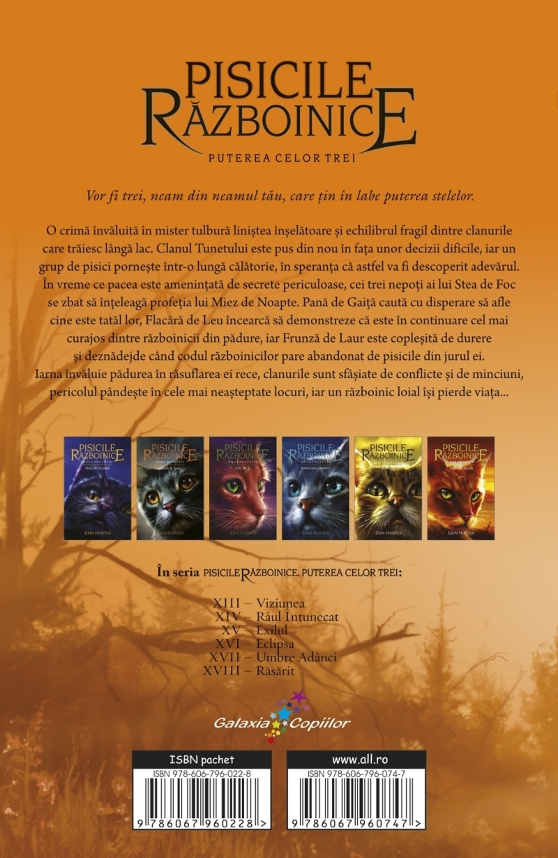 Cu 40 de milioane de exemplare vândute în toată lumea, romanele Fantasy Pisicile Războinice au cucerit teritorii vaste în inimile cititorilor de toate vârstele. Fanii lor din România se întâlnesc acum cu Cartea a XVIII-a – Răsărit –, ultimul volum din seria Puterea celor trei.