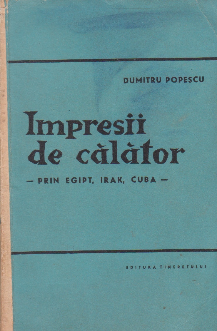 Comandă online cartea "Impresii de calator - Prin Egipt, Irak, Cuba" la 10,50 lei scrisă de Dumitru Popescu, tiparită la editura Tineretului în anul 1962 cu un număr de 239 pagini. Livrare din stoc cu plata ramburs sau online cu cardul.