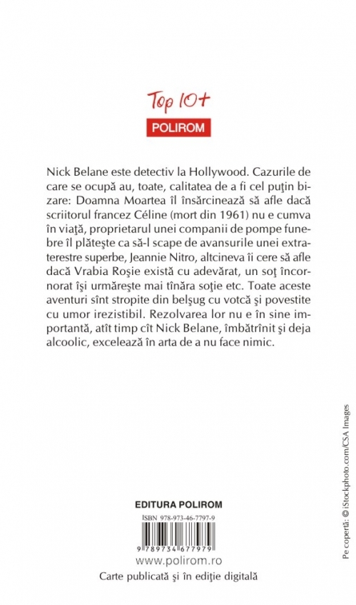 Nick Belane este detectiv la Hollywood. Cazurile de care se ocupă au, toate, calitatea de a fi cel puţin bizare: Doamna Moartea îl însărcinează să afle dacă scriitorul francez Céline (mort din 1961) nu e cumva în viaţă, proprietarul unei companii de pompe funebre îl plăteşte ca să-l scape de avansurile unei extraterestre superbe, Jeannie Nitro, altcineva îi cere să afle dacă Vrabia Roşie există cu adevărat, un soţ încornorat îşi urmăreşte mai tînăra soţie etc. Toate aceste aventuri sînt stropite din belşug cu votcă şi povestite cu umor irezistibil. Rezolvarea lor nu e în sine importantă, atît timp cît Nick Belane, îmbătrînit şi deja alcoolic, excelează în arta de a nu face nimic.