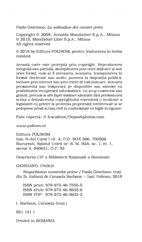 Comandă online cartea "Singurătatea numerelor prime (ediţie de buzunar)" la 36,90 lei isbn 9789734675555 scrisă de Paolo Giordano, tiparită la editura Polirom face parte din colecția Top 10+. Cartea poate fi livrată în circa 2 zile cu plata ramburs sau online cu cardul.