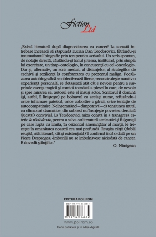 O poveste reală despre încercarea de a supraviețui prin ficțiune, o narațiune alertă și acaparantă despre lumi care se construiesc acolo unde limitele organismului nu te lasă să ajungi. Romanul autobiografic al lui Teodorovici este locul în care, rînd pe rînd, superstițiile se transformă în miracole, iar miracolele pot fi oricînd luate drept coincidențe, lăsîndu-i cititorului libertatea de a umple cu sens întîmplările.