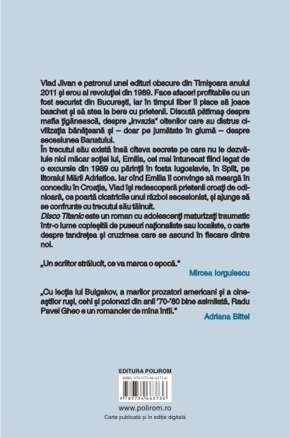 Disco Titanic este un roman cu adolescenţi maturizaţi traumatic într-o lume copleşită de puseuri naţionaliste sau localiste, o carte despre tandreţea şi cruzimea care se ascund în fiecare dintre noi.