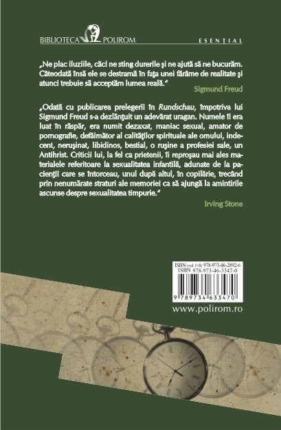 „Odata cu publicarea prelegerii in Rundschau, impotriva lui Sigmund Freud s-a dezlantuit un adevarat uragan. Numele ii era luat in raspar, era numit dezaxat, maniac sexual, amator de pornografie, defaimator al calitatilor spirituale ale omului, indecent, nerusinat, libidinos, bestial, o rusine a profesiei sale, un Antihrist. Criticii lui, la fel ca prietenii, ii reprosau mai ales materialele referitoare la sexualitatea infantila, adunate de la pacientii care se intorceau, unul dupa altul, in copilarie, trecind prin nenumarate straturi ale memoriei ca sa ajunga la amintirile ascunse despre sexualitatea timpurie.” (Irving Stone)