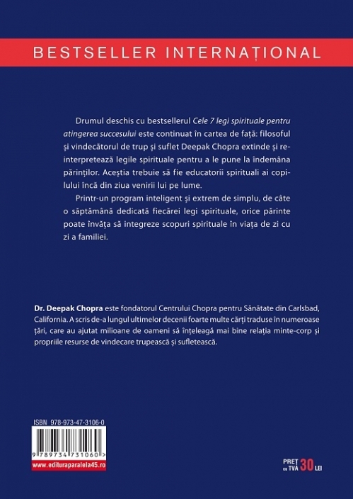 Drumul deschis cu bestsellerul Cele 7 legi spirituale pentru atingerea succesului este continuat în cartea de față: filosoful și vindecătorul de trup și suflet Deepak Chopra extinde și reinterpretează legile spirituale pentru a le pune la îndemâna părinților. Aceștia trebuie să fie educatorii spirituali ai copilului încă din ziua venirii lui pe lume.