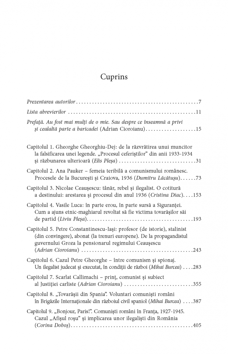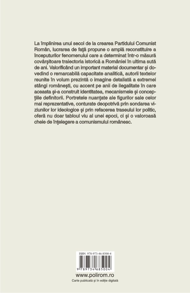 La împlinirea unui secol de la crearea Partidului Comunist Român, lucrarea de față propune o amplă reconstituire a începuturilor fenomenului care a determinat într-o măsură covîrșitoare traiectoria istorică a României în ultima sută de ani. Valorificînd un important material documentar și dovedind o remarcabilă capacitate analitică, autorii textelor reunite în volum prezintă o imagine detaliată a extremei stîngi românești, cu accent pe anii de ilegalitate în care aceasta și-a construit identitatea, mecanismele și concepțiile definitorii. Portretele nuanțate ale figurilor sale celor mai reprezentative, conturate deopotrivă prin sondarea viziunilor lor ideologice și prin refacerea traseului lor politic, oferă nu doar tabloul viu al unei epoci, ci și o valoroasă cheie de înțelegere a comunismului românesc.