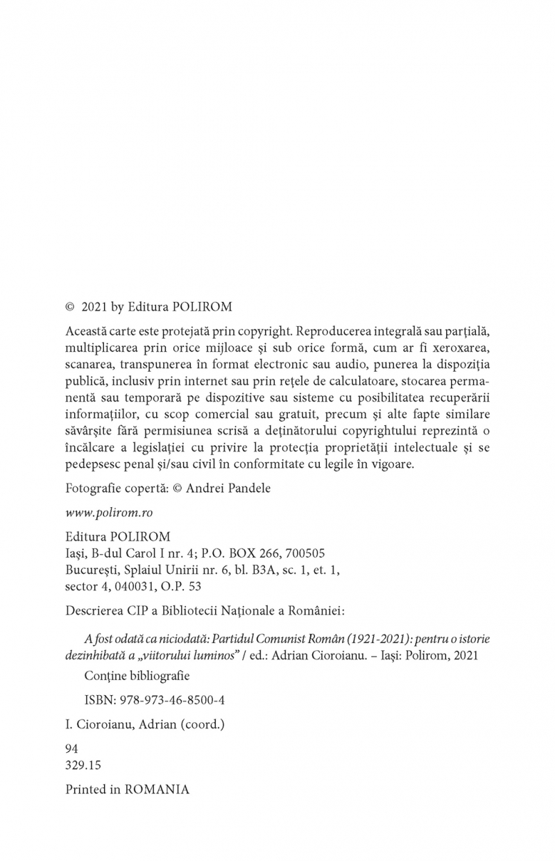 „Autorii volumului de față au decis să se întoarcă spre începutul poveștii comunismului românesc. Vom vedea aici, împreună, ecourile unor ani în care simpatiile comuniste erau mai curînd un soi de exotism ideologic și nimeni nu ar fi putut bănui atunci că exotismul va putea deveni vreodată normă și dogmă. Într-o vreme în care niciun spirit lucid nu ar fi putut paria pe victoria comunismului în România, într-un timp în care însuși partidul ce purta acest nume era oficial interzis, totuși unii cetățeni ai acestei țări au activat cu patimă și entuziasm pentru victoria unor idei în care credeau cu încrîncenare și chiar cu o doză bună de fanatism. Așadar, miza cărții este să prezinte pe baza arhivelor o parte din istoria și biografiile, cît mai reale, ale comuniștilor români ce activau în perioada interbelică sau în primii ani ai războiului. Mai precis, ne-au interesat procesele lor – adică întîlnirile lor (nedorite) cu sistemul de justiție românesc, în fața căruia cu toții erau pasibili de un păcat originar: a fi comunist în anii 1930 sau la începutul anilor 1940 însemna a fi un admirator al satrapului Stalin de la Kremlin. Spre stupefacția și neplăcerea justiției românești – ca și spre potențiala noastră uimire dezagreabilă astăzi –, astfel de admiratori au existat în România.” (Adrian Cioroianu)Comandă online cartea "A fost odată ca niciodată Partidul Comunist Român (1921-2021) Pentru o istorie dezinhibată a „viitorului luminos”" la 63,40 lei isbn 9789734685004 scrisă de Adrian Cioroianu, tiparită la editura Polirom face parte din colecția -. Cartea poate fi livrată în circa 2 zile cu plata ramburs sau online cu cardul.