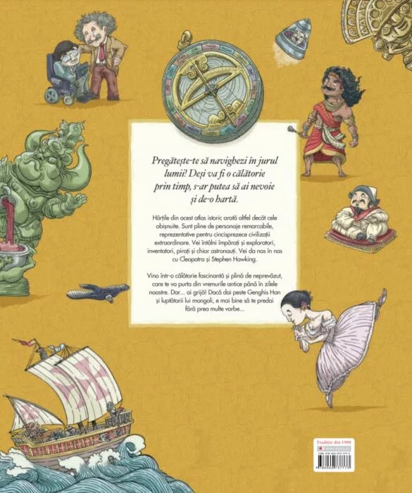 Hărțile din acest atlas istoric arată altfel decât cele obișnuite. Sunt pline de personaje remarcabile, reprezentative pentru cincisprezece civilizații extraordinare. Vei întâlni împărați și exploratori, inventatori, pirați și chiar astronauți. Vei da nas în nas cu Cleopatra și Stephen Hawking. Vino într-o călătorie fascinantă și plină de neprevăzut, care te va purta din vremurile antice pânâ în zilele noastre. Dar... ai grijă! Dacă dai peste Genghis Han și luptătorii lui mongoli, e mai bine să te predai fără prea multe vorbe...