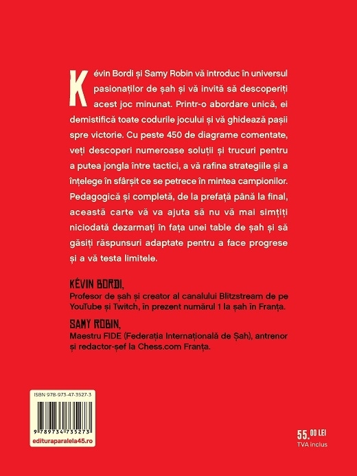 Kévin Bordi și Samy Robin vă introduc în universul pasionaților de șah și vă invită să descoperiți acest joc minunat. Printr-o abordare unică, ei demistifică toate codurile jocului și vă ghidează pașii spre victorie. Cu peste 450 de diagrame comentate, veți descoperi numeroase soluții și trucuri pentru a putea jongla între tactici, a vă rafina strategiile și a înțelege în sfârșit ce se petrece în mintea campionilor. Pedagogică și completă, de la prefață până la final, această carte vă va ajuta să nu vă mai simțiți niciodată dezarmați în fața unei table de șah și să găsiți răspunsuri adaptate pentru a face progrese și a vă testa limitele.