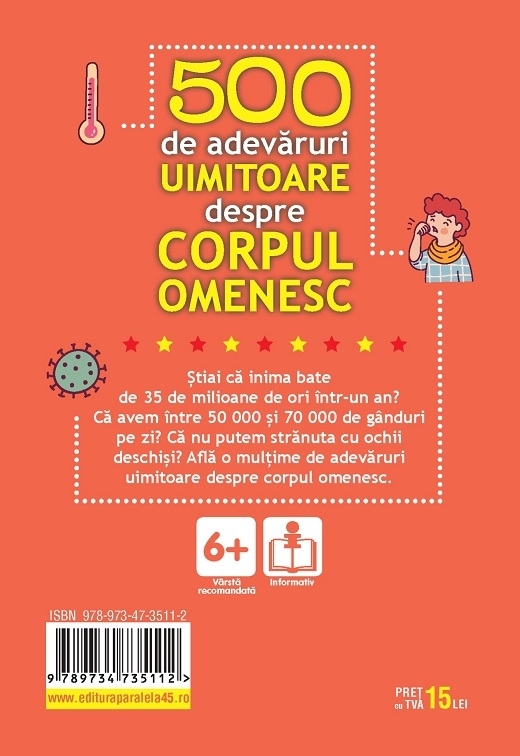 Comandă online cartea "500 de adevăruri uimitoare despre corpul omenesc" la 21,10 lei isbn 9789734735112 scrisă de PARALELA 45, tiparită la editura Paralela 45 face parte din colecția 500 DE ADEVARURI. Cartea poate fi livrată în circa 2 zile cu plata ramburs sau online cu cardul.