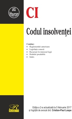 Comandă online cartea "Codul insolventei. Editia a 4-a, actualizata la 4 martie 2020" la 20,10 lei isbn 9786060250180 scrisă de Andreea Deli , Simona Milos, tiparită la editura Rosetti în anul 2020. Cartea poate fi livrată în circa 2 zile cu plata ramburs sau online cu cardul.