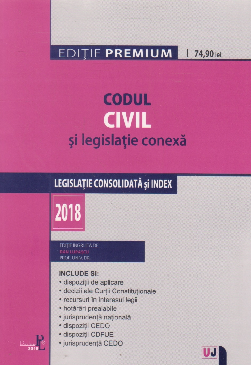 Comandă online cartea "Codul civil si legislatie conexa 2018. Editie premium" la 20,10 lei Dan Lupascu, tiparită la editura Universul Juridic în anul 2018 cu un număr de 650 pagini. Livrare din stoc cu plata ramburs sau online cu cardul.