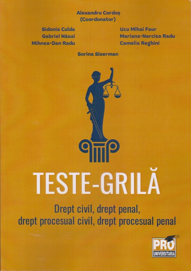 Comandă online cartea "Teste-grilă : drept civil, drept penal, drept procesual civil, drept procesual penal" la 50,70 lei isbn 9786062618995 scrisă de Sidonia Culda , Gabriel Nasui , Mihnea-Dan Radu , ... , Alexandru Cordoş, tiparită la editura Pro Universitaria în anul 2024. Cartea poate fi livrată în circa 2 zile cu plata ramburs sau online cu cardul.