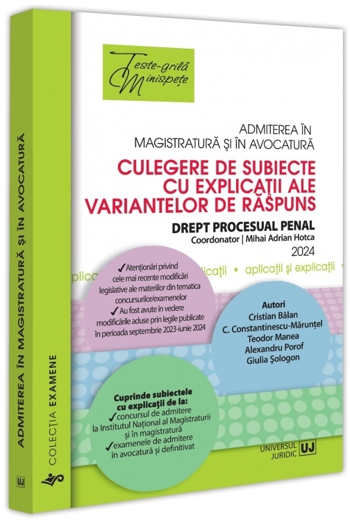 Comandă online cartea "Admiterea în magistratură şi în avocatură : culegere de subiecte cu explicaţii ale variantelor de răspuns,Drept procesual penal" la 96,26 lei isbn 9786063915352 scrisă de Cristian Bălan , Cătălin Constantinescu-Mărunţel , Teodor Manea , ... , Mihai Adrian Hotca, tiparită la editura Universul Juridic în anul 2024. Cartea poate fi livrată în circa 2 zile cu plata ramburs sau online cu cardul.
