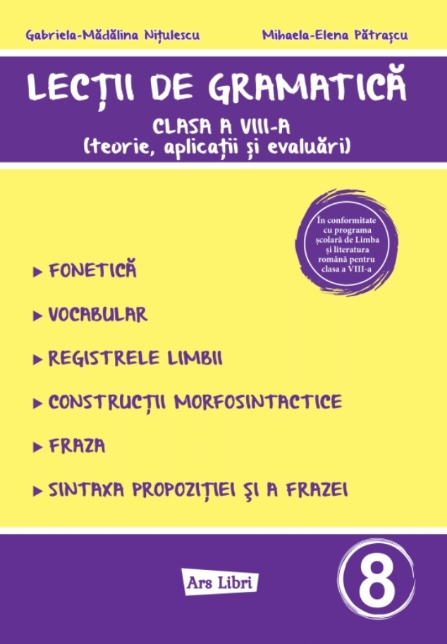 Comandă online cartea "Lecţii de gramatică : clasa a VIII-a,(teorie, aplicaţii şi evaluări)" la 35,00 lei isbn 9786063630705 scrisă de Gabriela-Madalina Nitulescu , Elena-Mihaela Pătraşcu , Mihaela-Elena Pătraşcu, tiparită la editura Ars Libri în anul 2025. Cartea poate fi livrată în circa 2 zile cu plata ramburs sau online cu cardul.