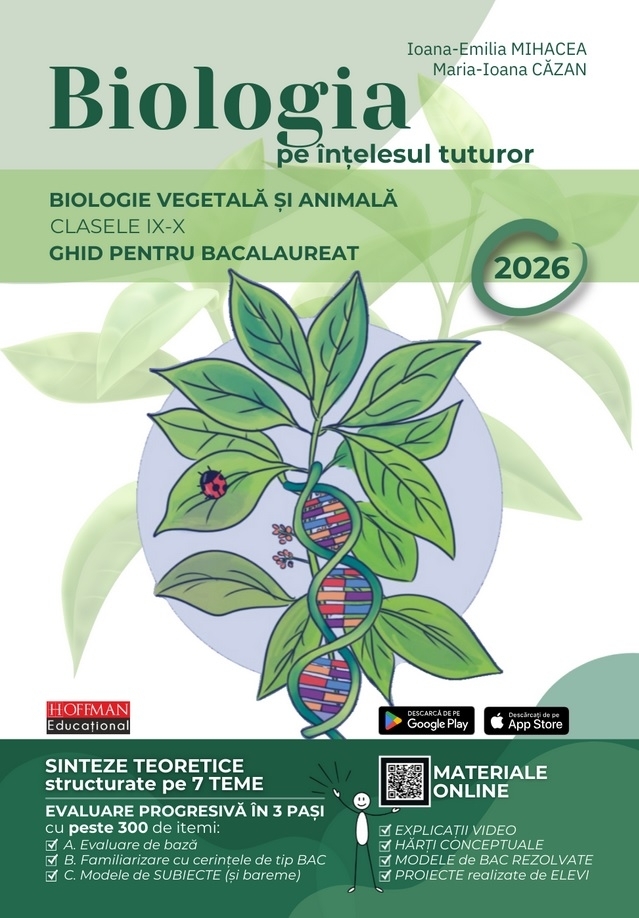 Comandă online cartea "Biologia pe înţelesul tuturor : biologie vegetală şi animală,clasele IX-X,ghid de pregătire a examenului de bacalaureat" la 81,51 lei isbn 9786064622488 scrisă de Ioana-Emilia Mihacea , Maria-Ioana Căzan , Maria Ioana Cazan, tiparită la editura Hoffman Educational în anul 2025. Cartea poate fi livrată în circa 2 zile cu plata ramburs sau online cu cardul.